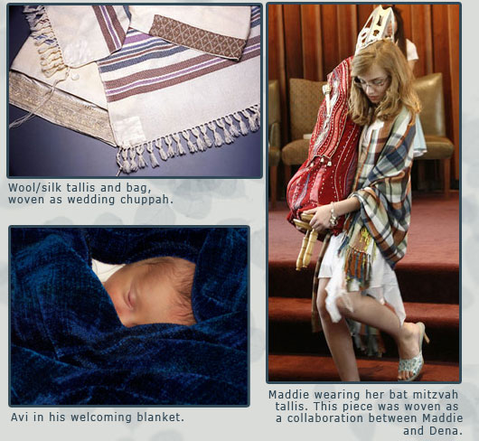 There is a deeply spiritual component to my weaving. I especially enjoy creating pieces to mark significant events and healings in peoples lives-whether it be a wedding blanket, created from ribbons that have written blessings on them, healing blankets, a tallis for a bar or bat mitzvahs, a wedding canopy or a special baby blanket.