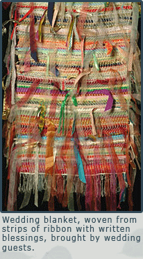 Wedding Blanket with written blessings“Weaving has come as a gift to me. Somewhere deep down, I have always been a weaver. The feeling of threads running through my fingers, the motion of the shuttle going back and forth are in my body, found in the way that my body will find a move in dance. The process of learning to weave felt like rediscovering something I knew a long, long time ago.”